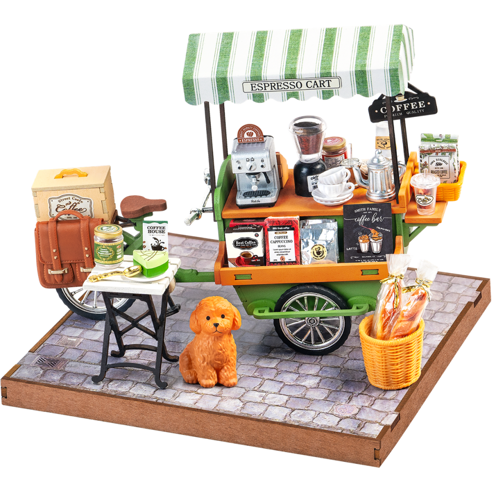 De Rolife Aromatic Coffee Cart is een sfeervol houten bouwpakket voor volwassenen en kinderen vanaf 14 jaar. Erg leuk voor liefhebbers van koffie en knusse miniaturen. Deze charmante fietsventer met groen baldakijn zit vol nostalgische details, zoals een vintage koffiekan, potjes koffie, vers stokbrood in een rieten mand en een klein tafeltje met gebak. Zelfs een lieve pup ontbreekt niet.