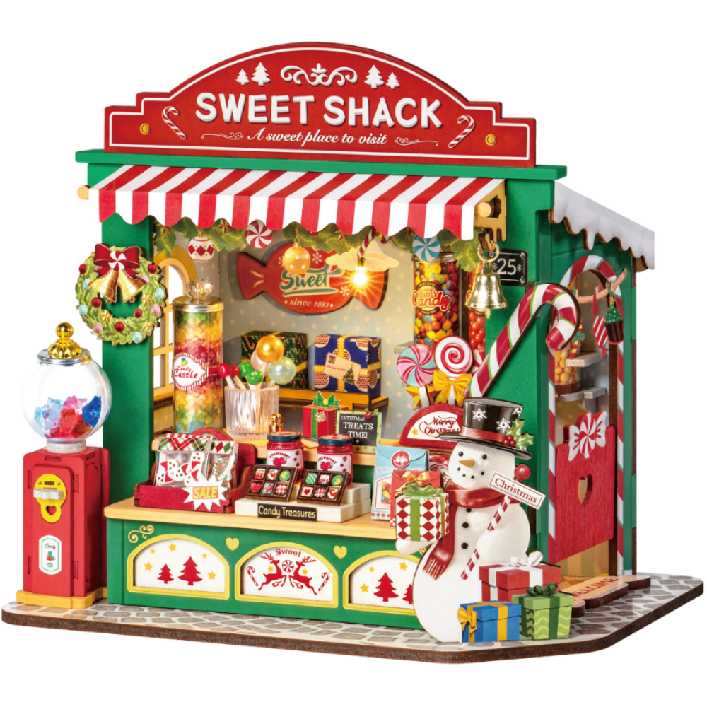 De Sweet Shack van Robotime Rolife is een houten bouwpakket in winterse kerstsferen voor iedereen vanaf 14 jaar oud. Dit model van een schattige miniatuur snoepwinkel roept het kerstgevoel op. Het is gehouden in de klassieke kerstkleuren rood en groen. We vinden een sneeuwpop omringd door kerstcadeautjes, een toonbank gevuld met overheerlijke chocolaatjes en ander lekkers en een snoep automaat.