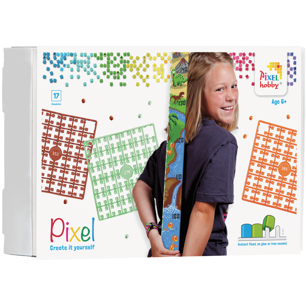 Een Pixelhobby pakket voor de groeimeters bevat: plan, 17 kleine basisplaten, +-85 pixelmatjes en 16 zwaluwstaartjes
