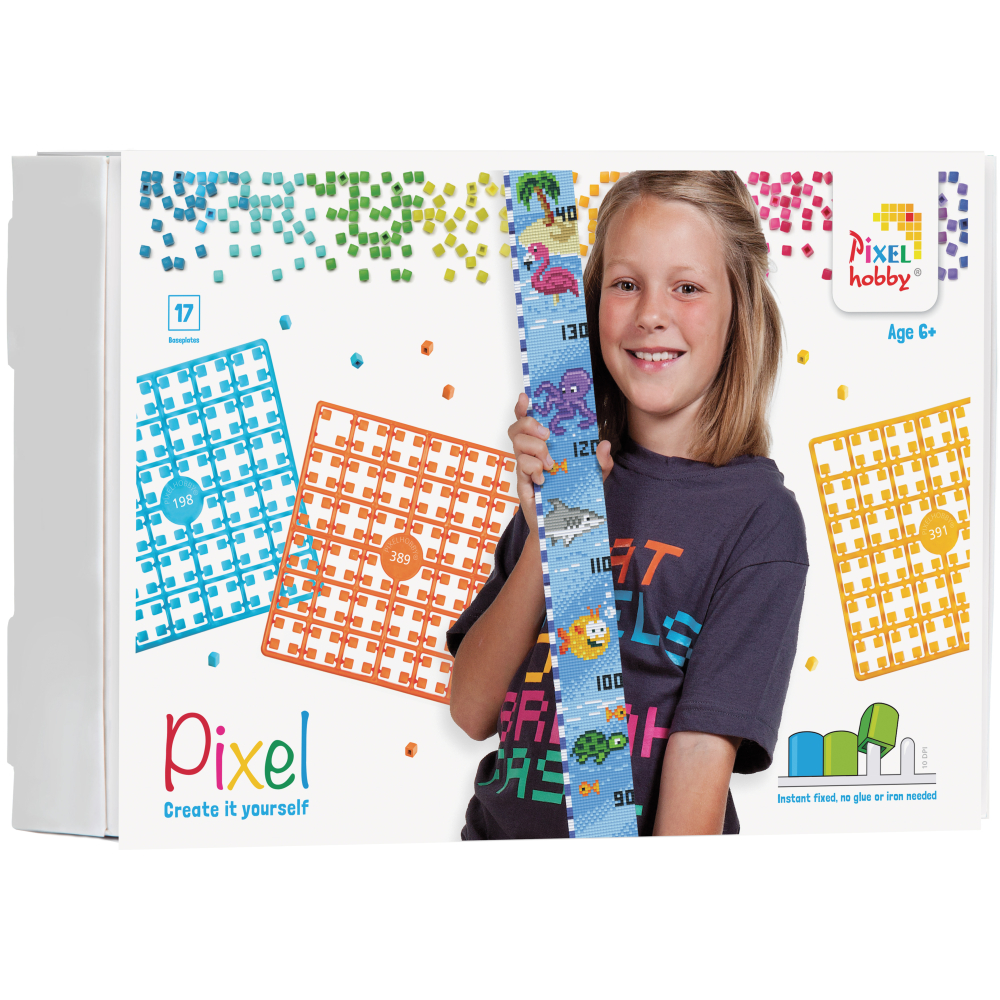 Een Pixelhobby pakket voor de groeimeters bevat: plan, 17 kleine basisplaten, +-85 pixelmatjes en 16 zwaluwstaartjes